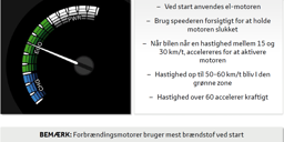Ved høje hastigheder og hurtig acceleration vil bilen som udgangspunkt ikke køre på ren el, men op en kombination af brændstof og el. Der hvor du får mest glæde ved Hybridteknologien er ved bykørsel.