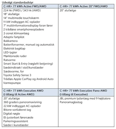 Mens den forhjulstrukne udgave af C-HR+ udelukkende kan fås i udstyrsudgaven Active - og med mulighed for tilvalg af 20" alufælge - kan den firehjulstrukne udgave fås både i udstyrsvarianten Active og topudgaven, Executive. Her får man udover firehjulstrækket og de ekstra hestekræfter som standard også 20" alufælge, sortlakeret bitone tag, 360 graders panoramakamera, intelligent parkeringsassistent, sæder i kunstlæder, digital nøgle, indbygget 22 kW oplader og el-justerbart førersæde.
